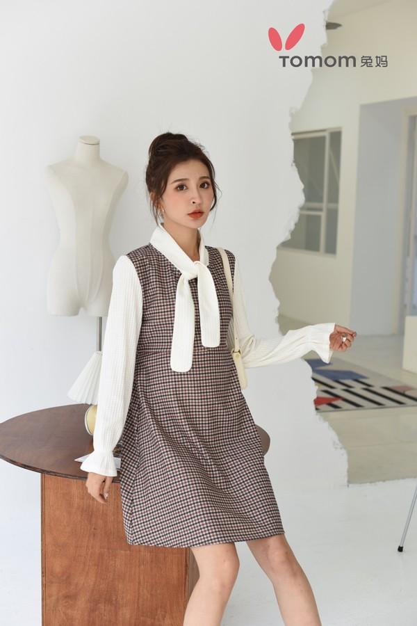 这件格纹拼接连衣裙,采用最经典的格纹元素与条纹白色相碰撞,大胆的设计却意外有种优雅的感觉,领口处采用圆领系带,象征着母性的柔和,整件衣服优雅大气,直筒版型,避免身材雷区,让孕妈妈更有气质。